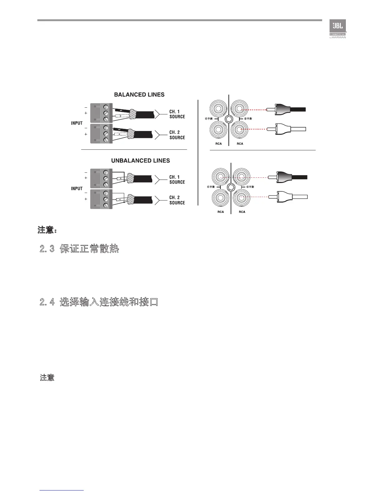 JBL Professional建议您采用已有的或专业的平衡线(带两根屏蔽导线),22-24线规的电缆