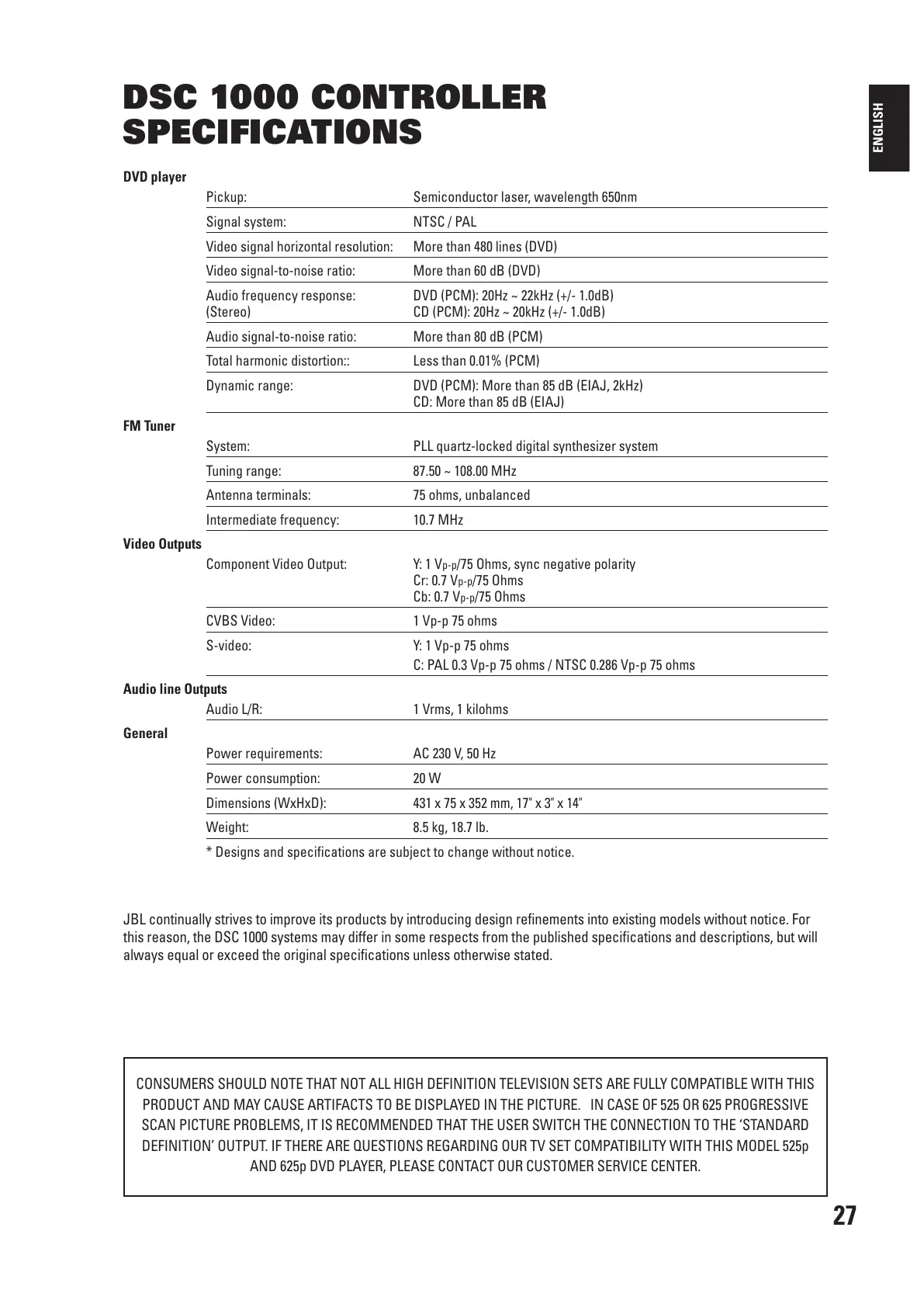 JBL continually strives to improve its products by introducing design refinements into existing models without notice. For