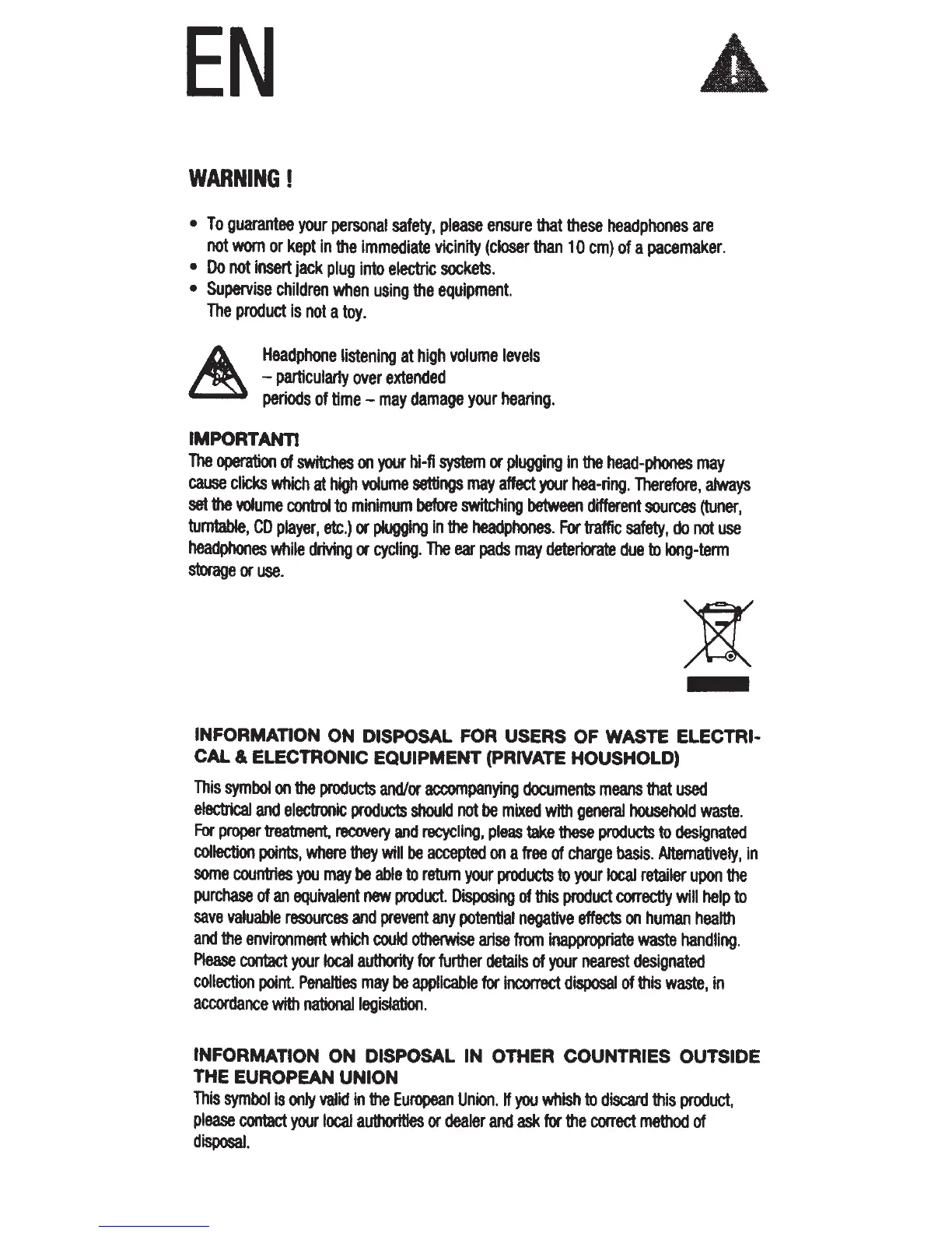 JBL E25BT - Important Safety Warnings; General Warnings; Important Usage Notes; Waste Electrical;Electronic Equipment Disposal (EU)