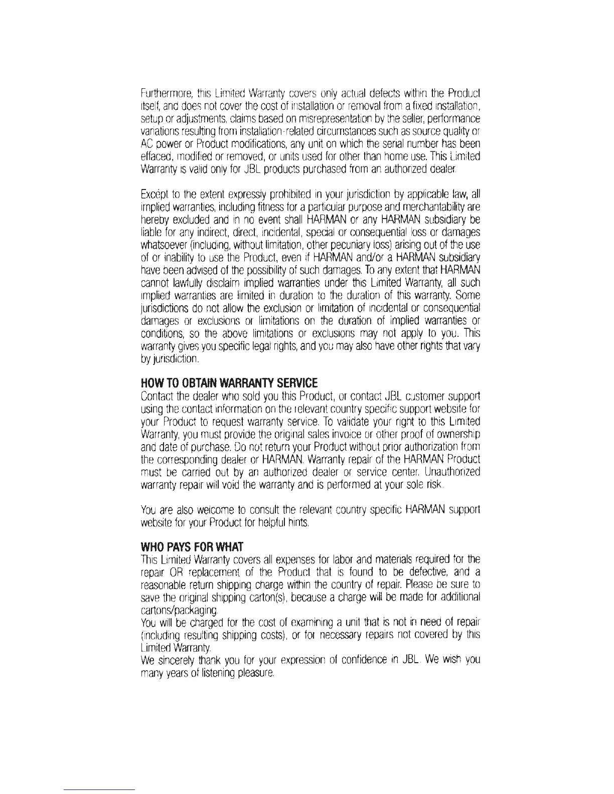 JBL E25BT - Warranty Service and Costs; Obtaining Warranty Service; Cost Responsibilities