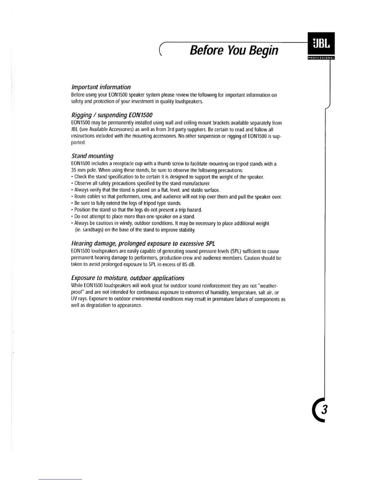 JBL EON 1500 - Before You Begin; Hearing Damage and Exposure