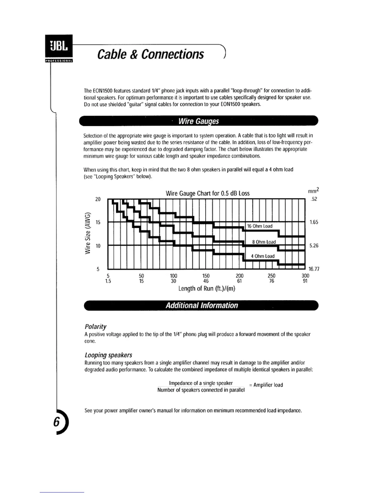 JBL EON 1500 - Cable and Connections; Wire Gauges
