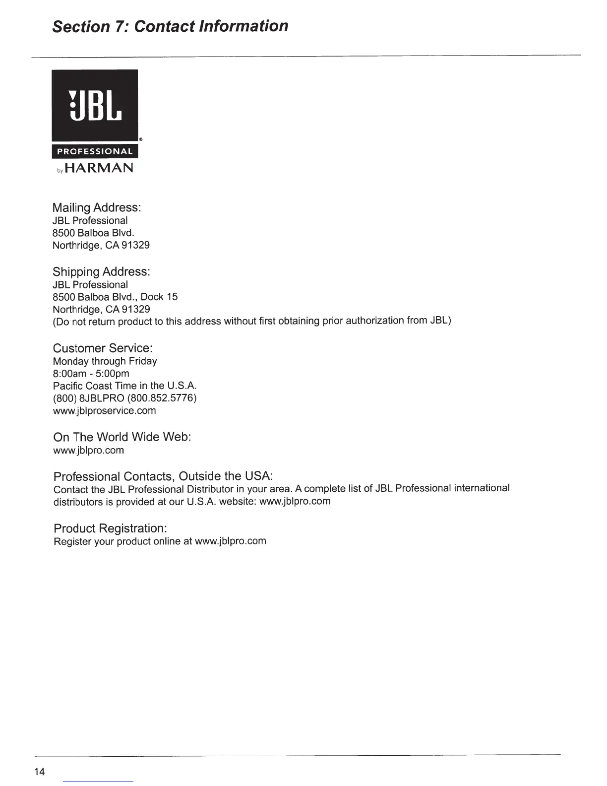 (Do not return product to this address without first obtaining prior authorization from JBL)