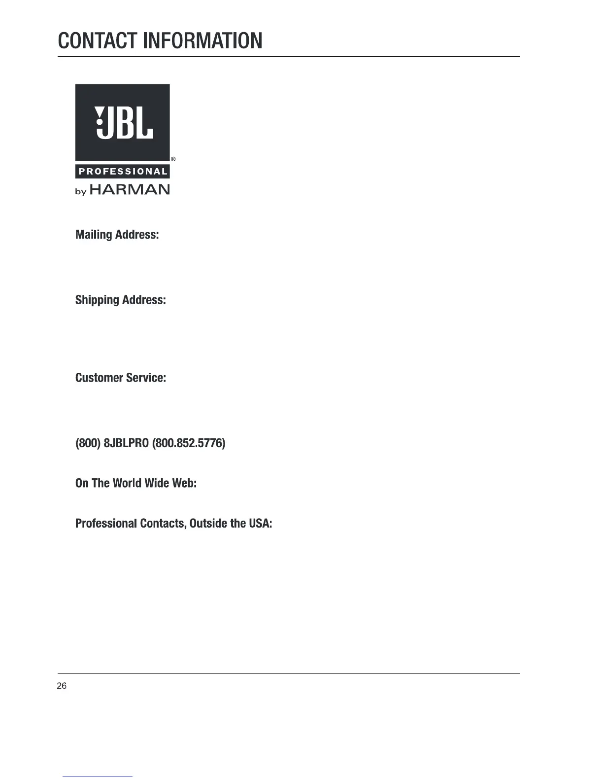 A complete list of JBL Professional international distributors is provided at our U.S.A. website: www.jblpro.com