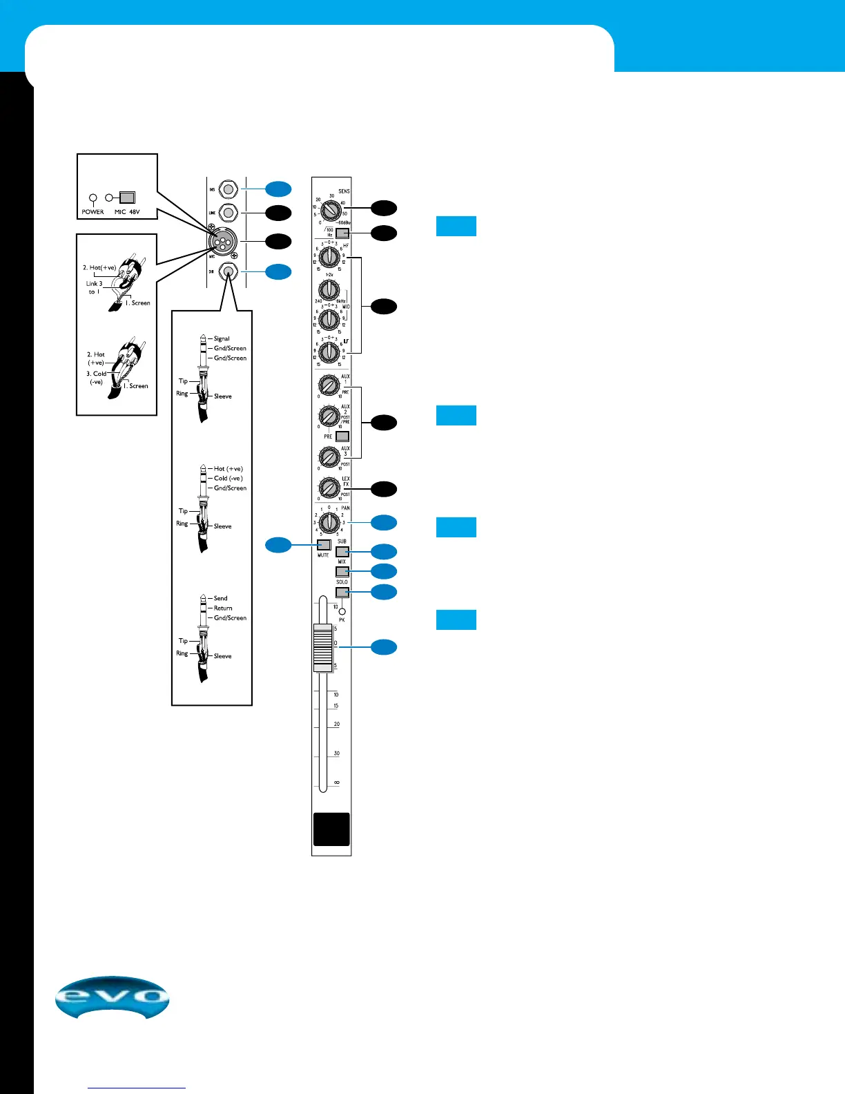 Pressing SUB routes the channel signal to Sub L and R busses.