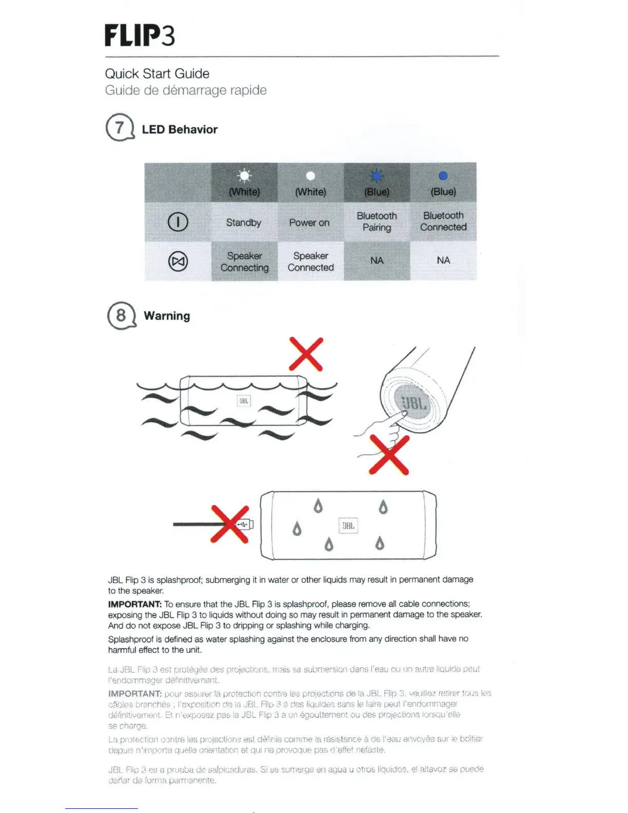 JBL FLIP3 - LED Behavior and Warnings; LED Behavior; Warnings and Precautions