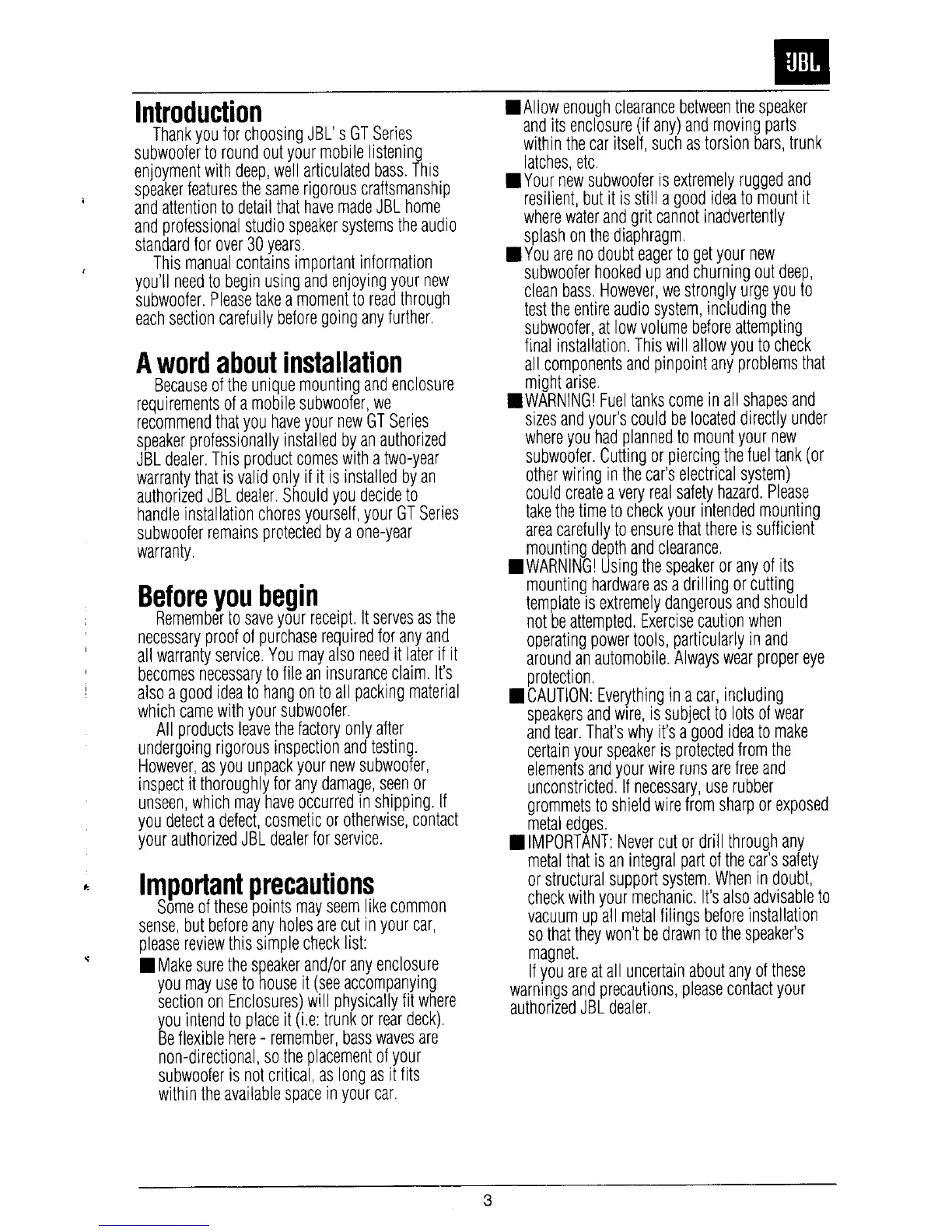 JBL GT102 - Introduction; Installation; Before You Begin; Important Precautions