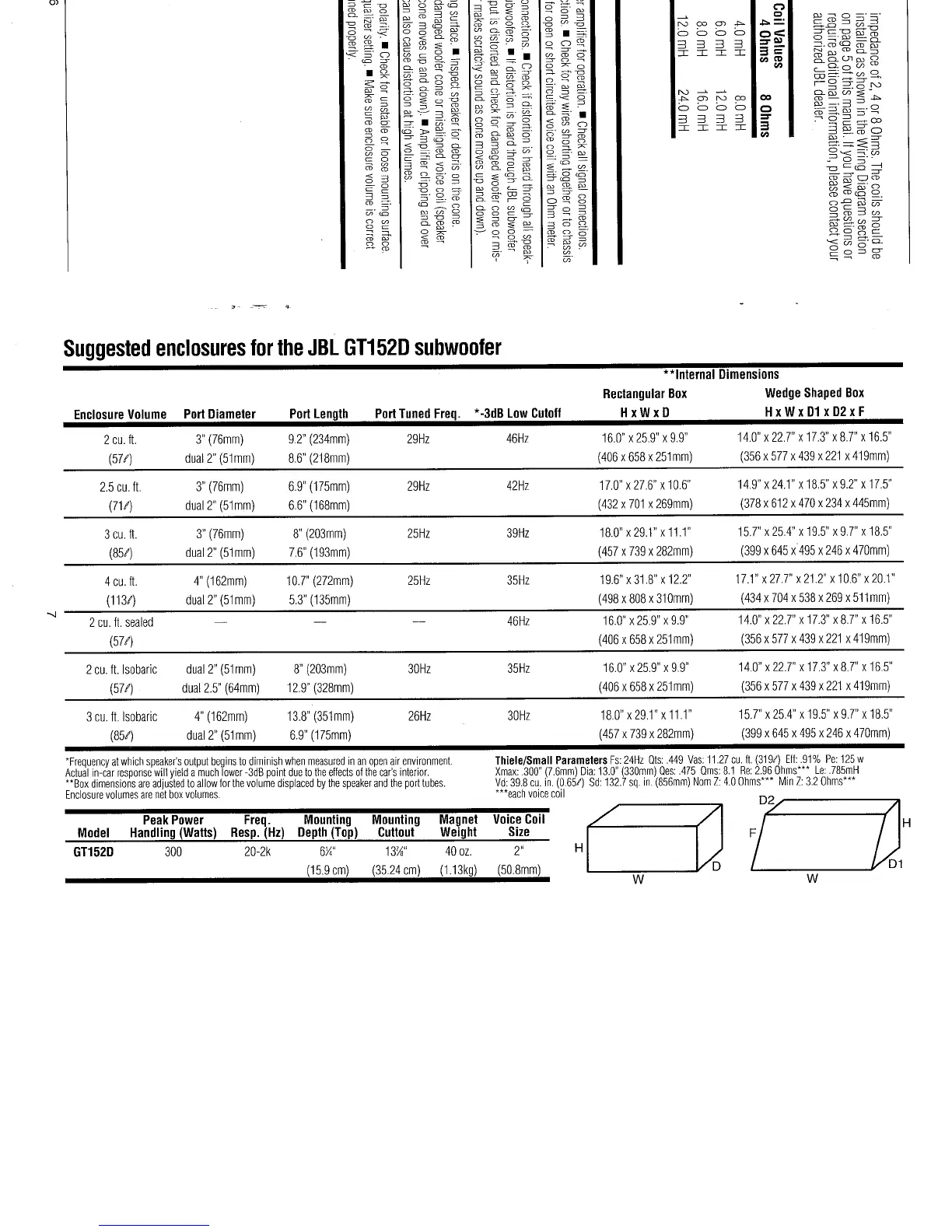 JBL GT152 - Suggested enclosures for the JBL GT152 D subwoofer; Coil Values