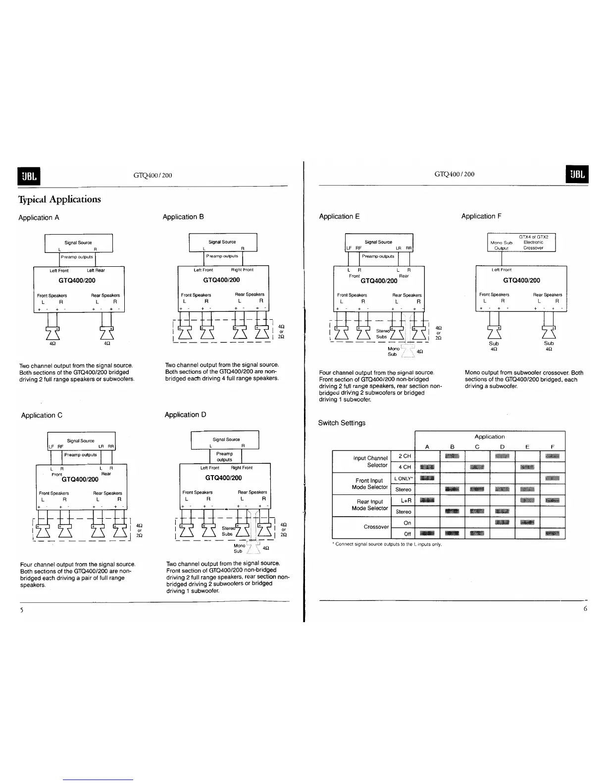 JBL GTQ200 - Typical Applications and Switch Settings; Switch Settings