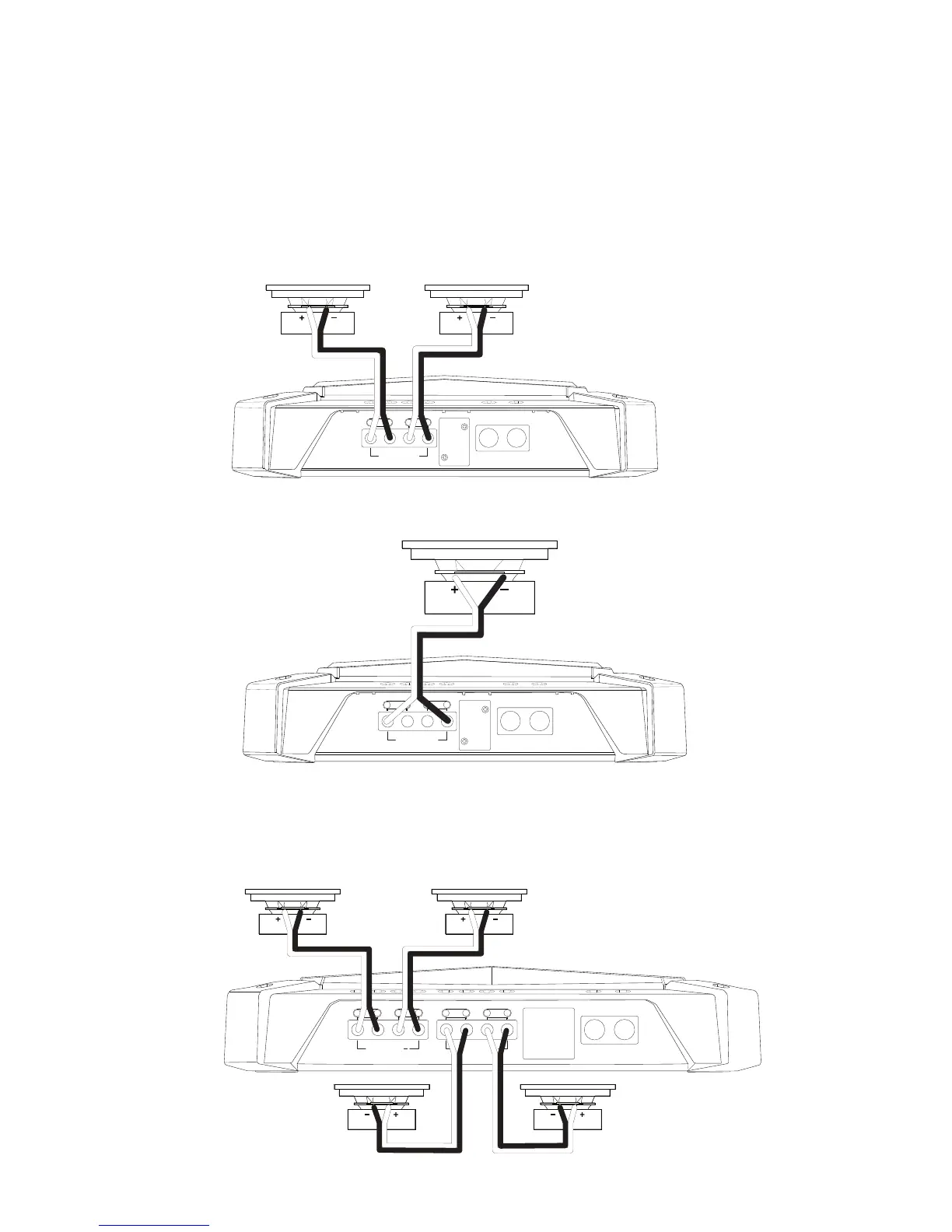 Connect speakers to terminals observing proper polarity: connect each speaker’s positive (+) lead to the appropriate positive (+) terminal, and negative (-)