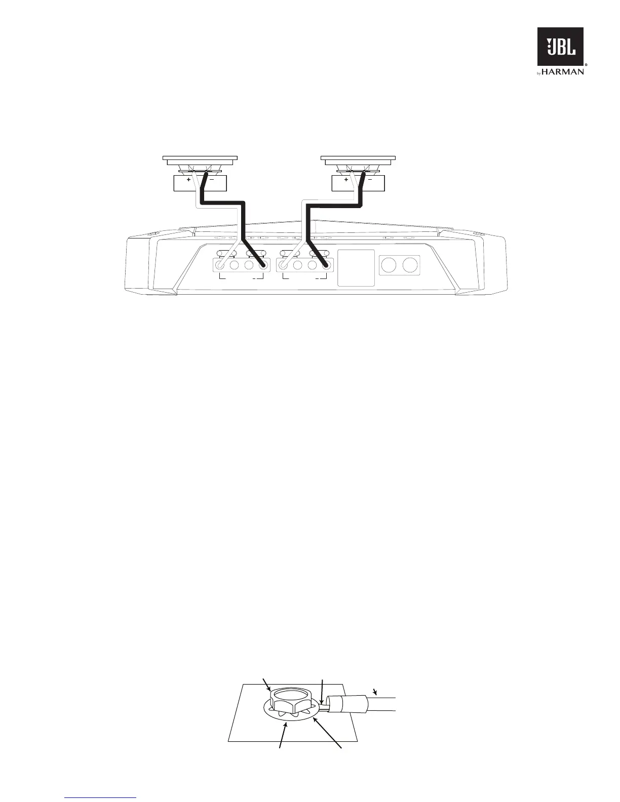 For 2-channel (bridged) operation connect one speaker’s + lead to the Front L+ terminal, and the - lead to the Front R- terminal. Connect the other