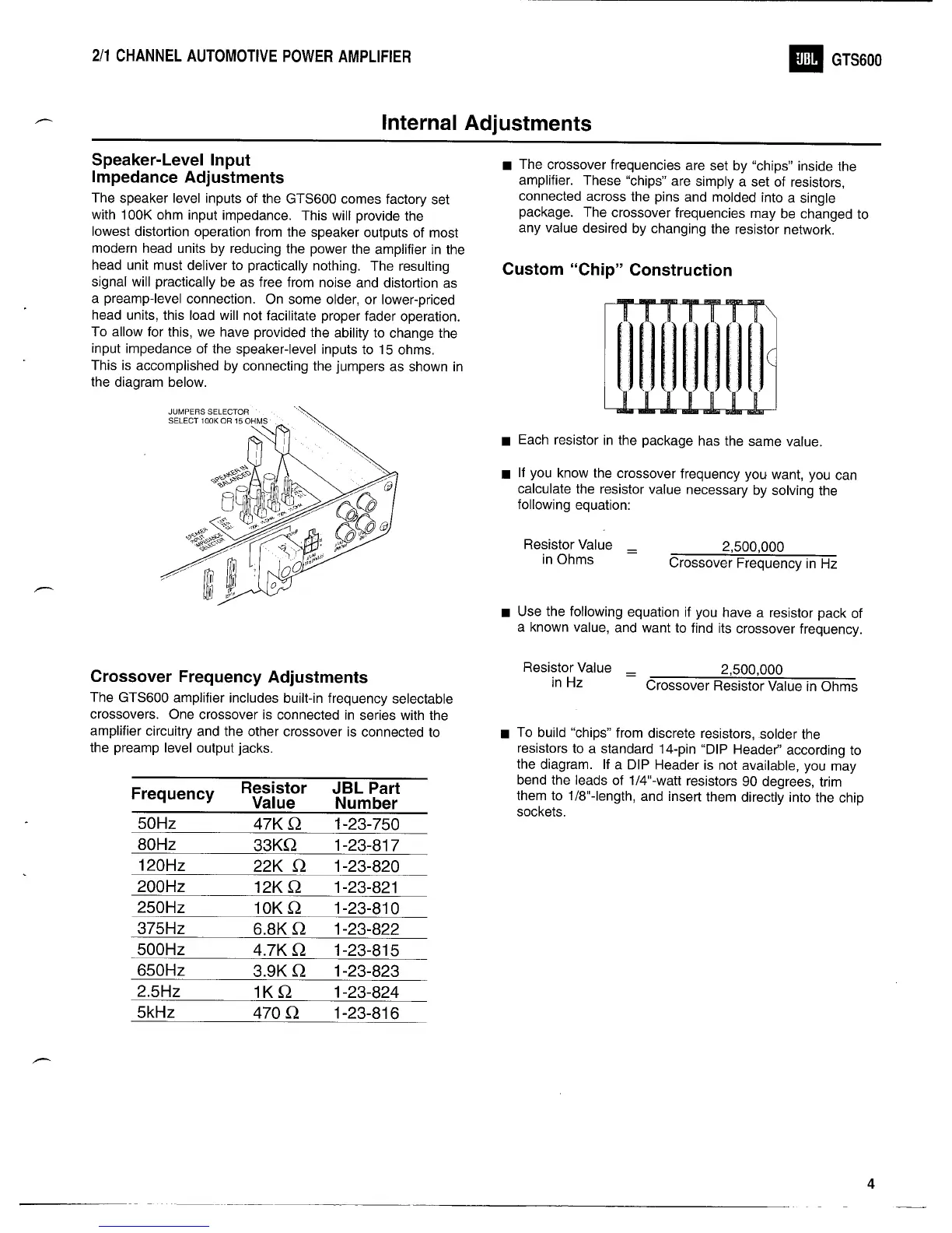 JBL GTS600 - Internal Adjustments; Speaker-Level Input Impedance Adjustment; Crossover Frequency Adjustment