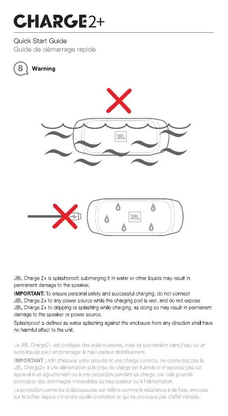 JBL Charge 2+ is splashproof; submerging it in water or other liquids may result in