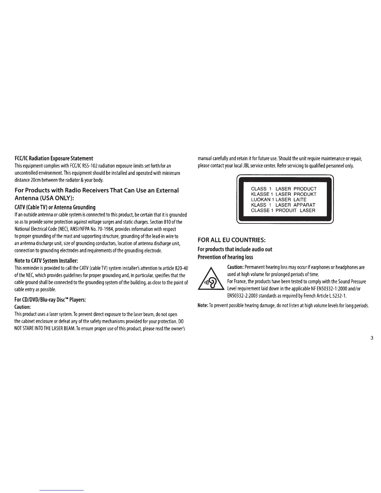 JBL Horizon - Regulatory and Exposure Information; Radiation Exposure and Antenna Grounding; Laser System Safety; EU Audio and Hearing Safety