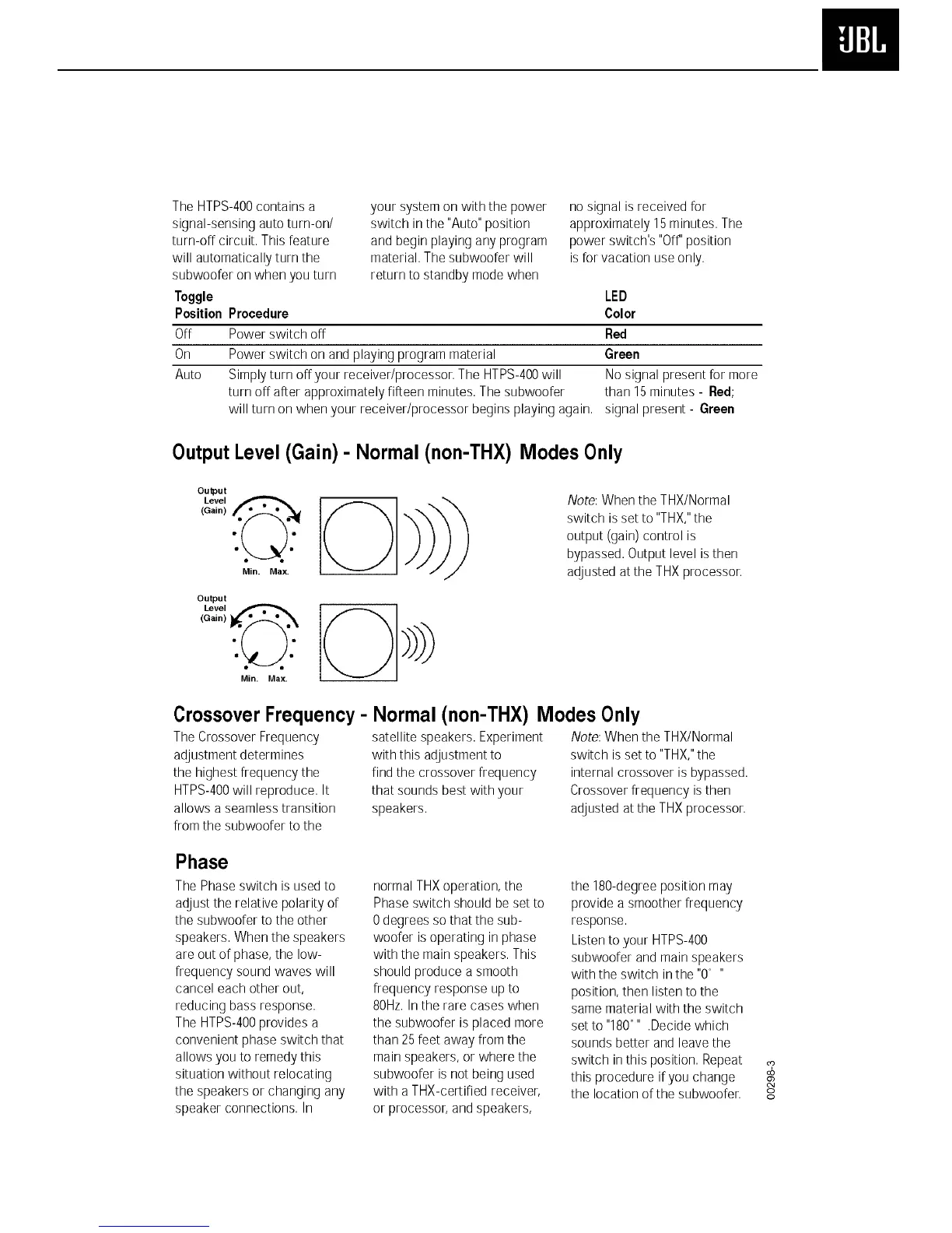 JBL HTPS-400 THX - Operation; Toggle Position Procedure
