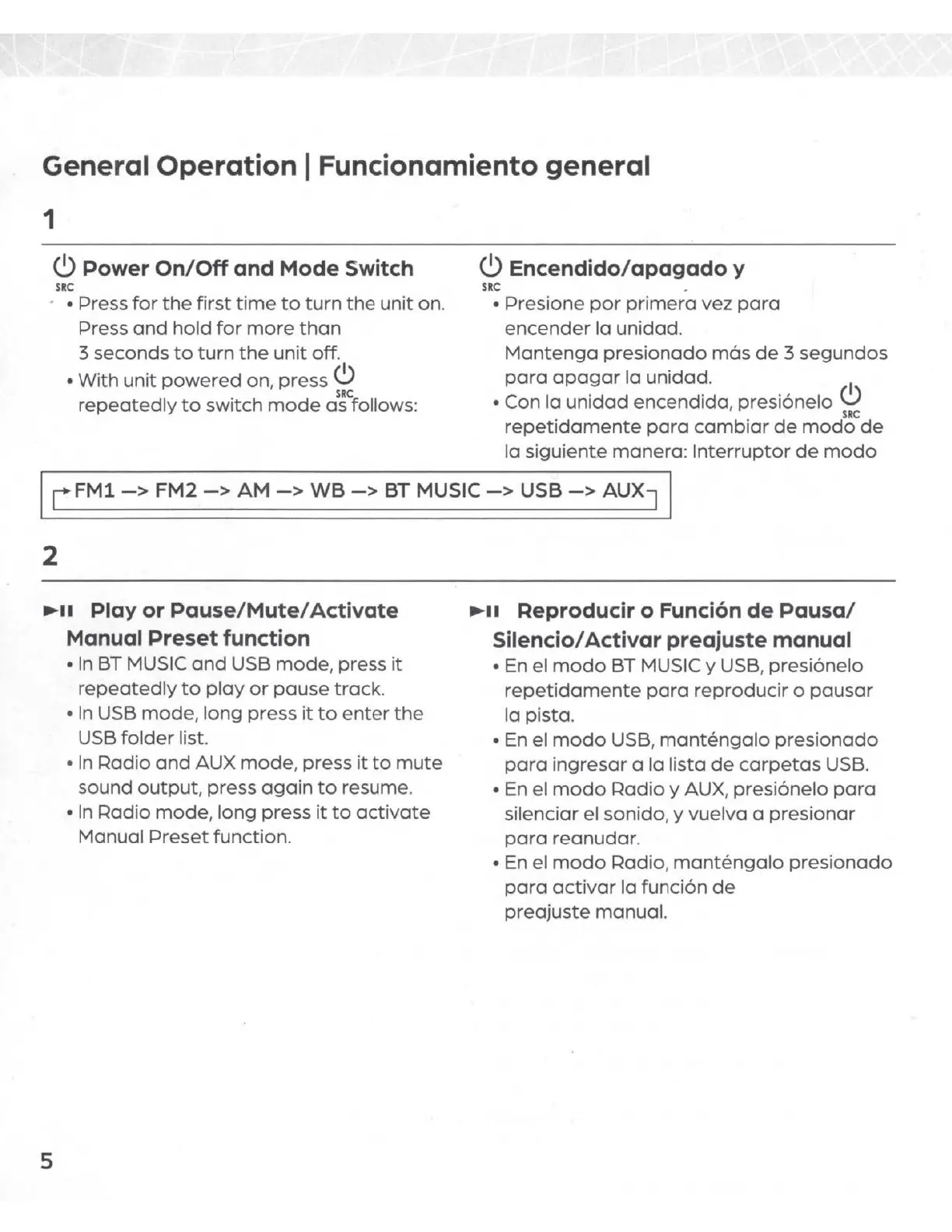 JBL JBL-R3500 - General Operation; Power On;Off and Mode Switching; Playback, Mute, and Preset Functions