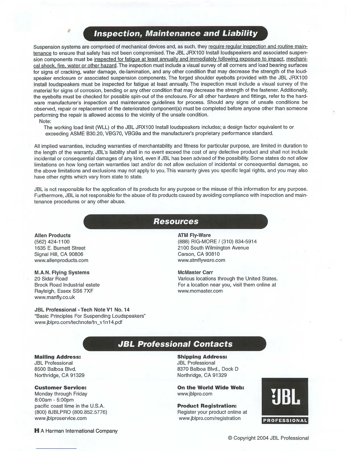 JBL JRX100 - Inspection, Maintenance, and Liability