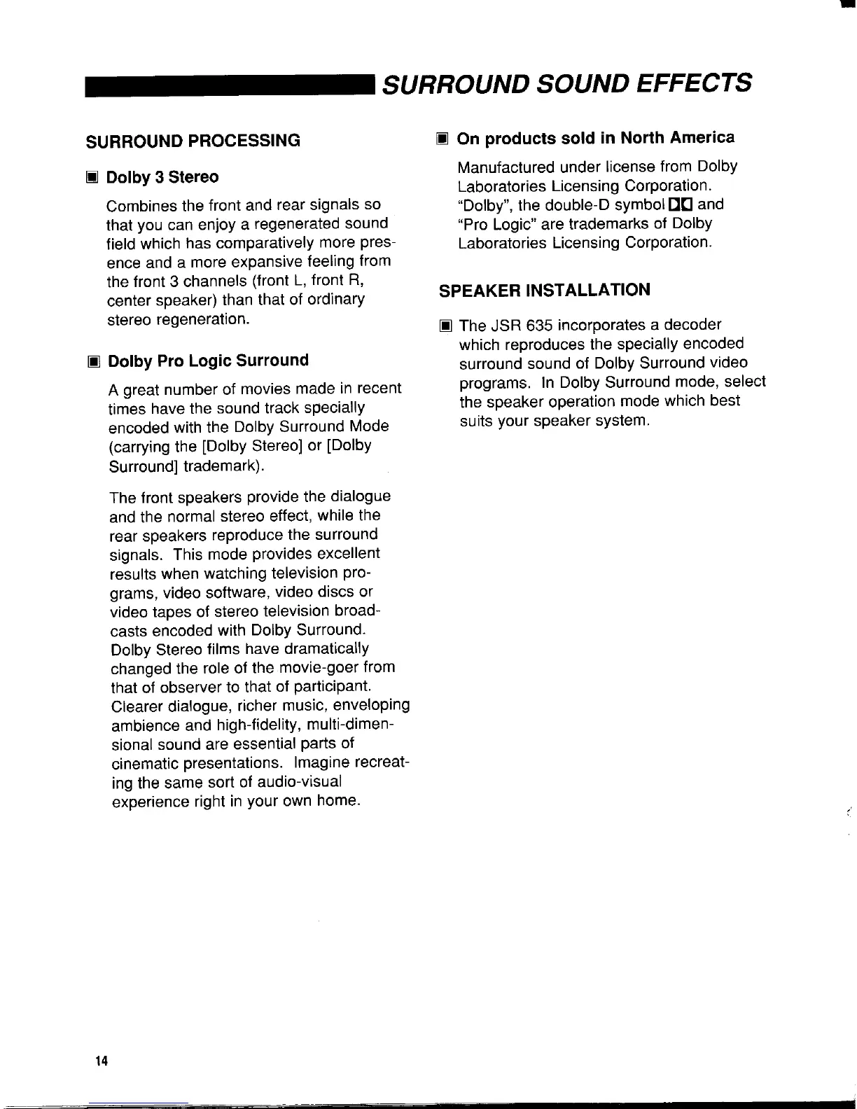 JBL JSR 635 - Surround Sound Effects; Dolby 3 Stereo; Dolby Pro Logic Surround
