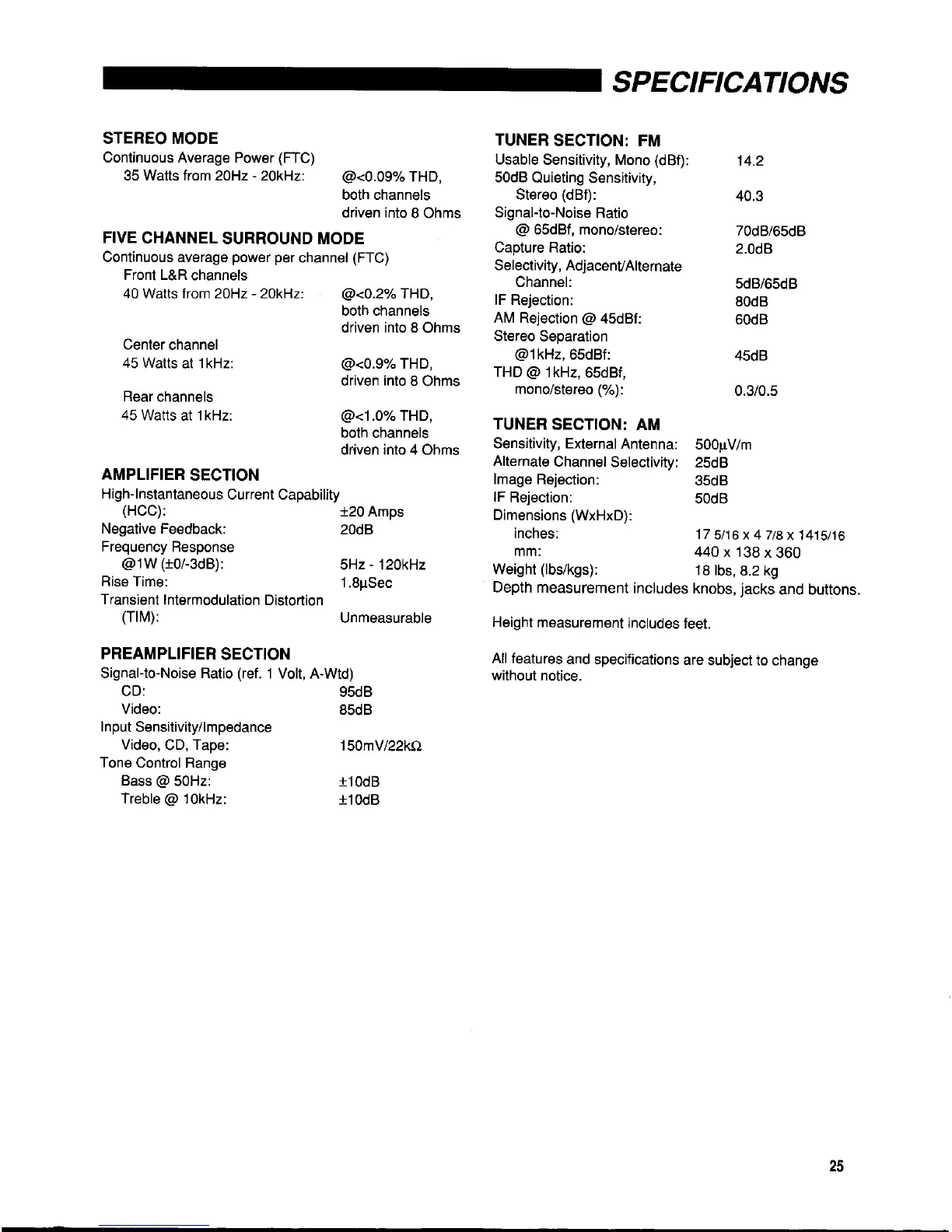 JBL JSR 635 - Specifications; Amplifier and Preamplifier Specifications; Tuner Section Specifications