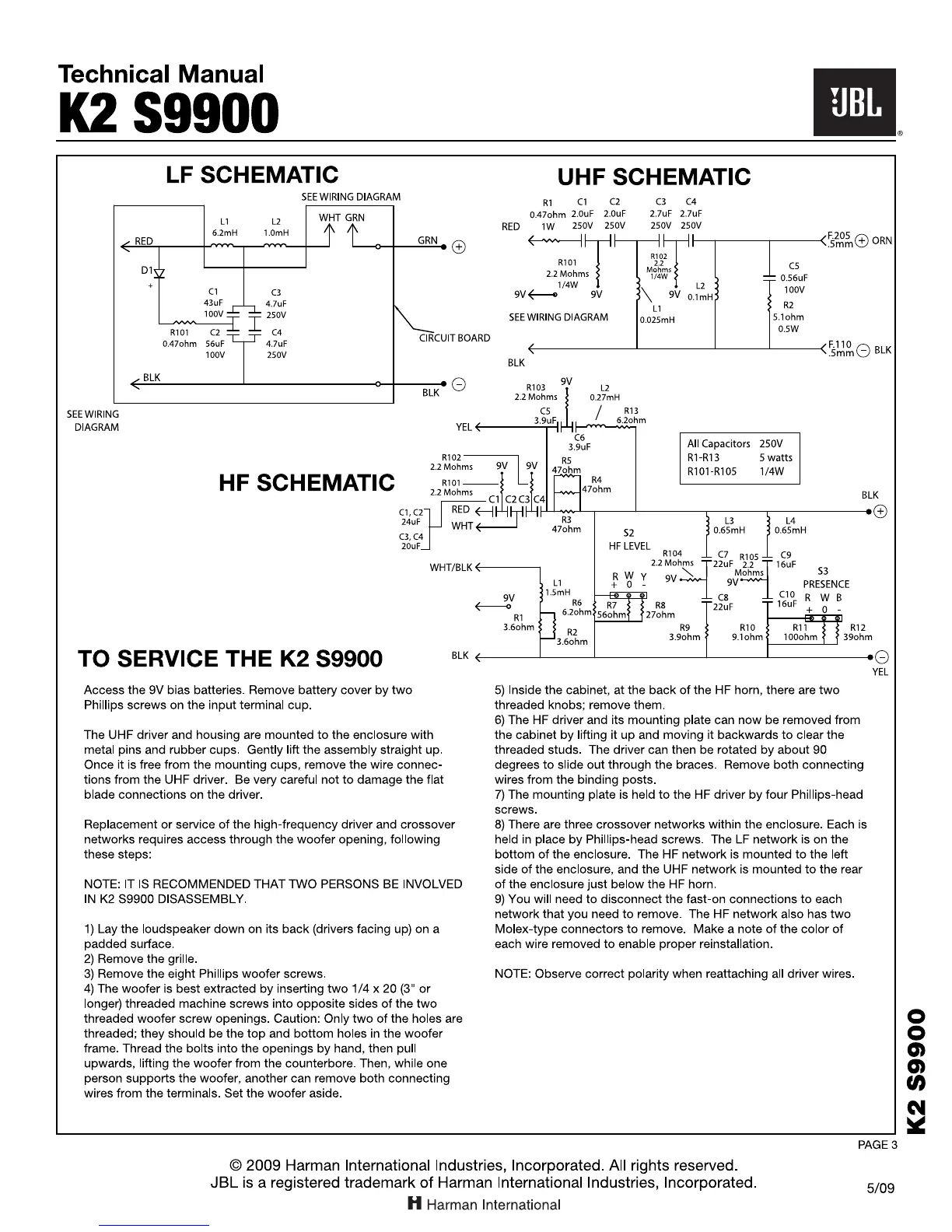 JBL K2 S9900 - Low-Frequency (LF) Schematic; High-Frequency (HF) Schematic; Ultrahigh-Frequency (UHF) Schematic; Service and Maintenance