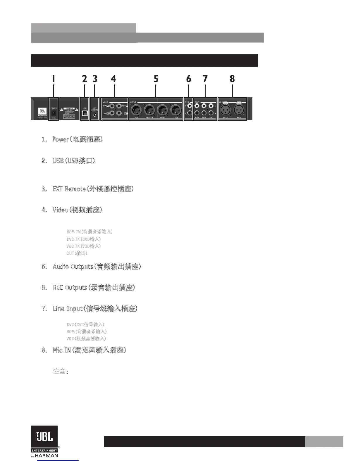 •BGM(背景音乐输入)--使用这对输入插座连接来自背景音乐信号源的音频信号。