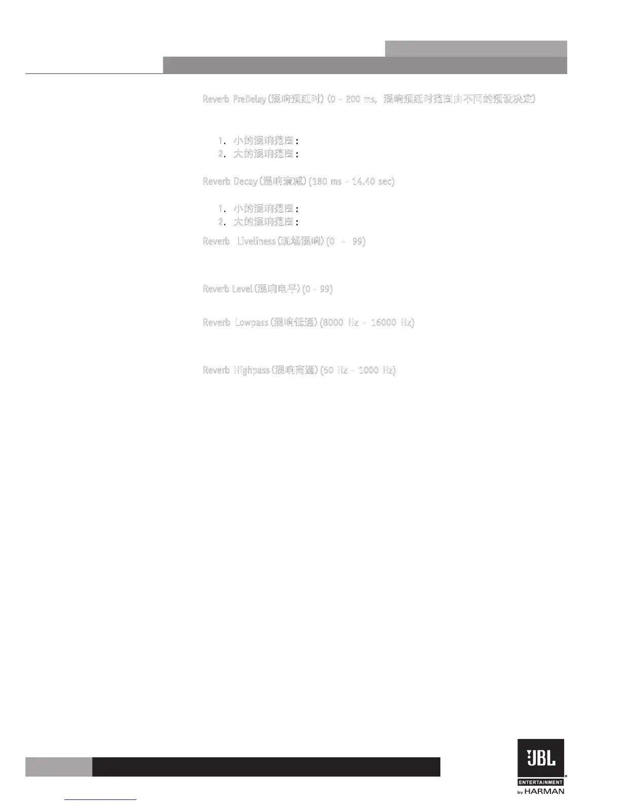• Reverb Decay(混响衰减)(180 ms - 14.40 sec)--调设混响衰减所需时间。数值越大