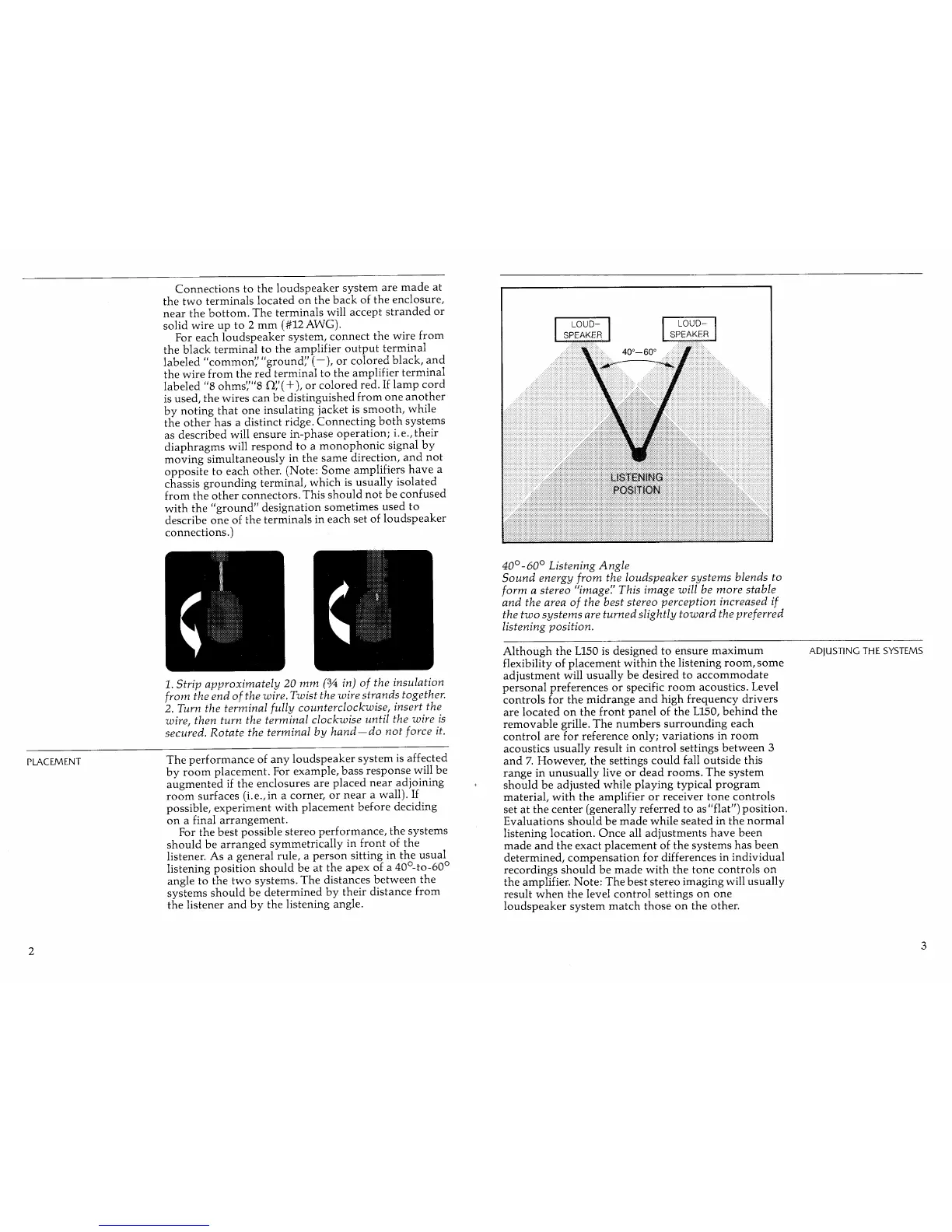 JBL L150 - Connecting the L150; Speaker Wire and Terminal Connections; Speaker Placement and Adjustment; Optimal Room Positioning