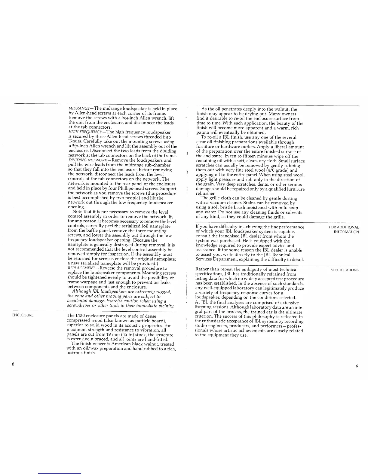 JBL L150 - Service and Enclosure Details; Component Removal Procedures; Enclosure Construction and Finish