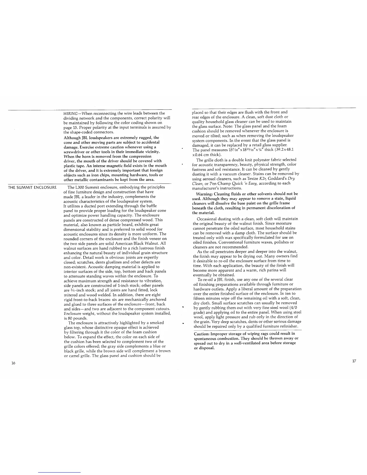 JBL L300 Summit - The Summit Enclosure; Wiring Polarity and Precautions; Driver Mouth Protection; Enclosure Construction and Materials