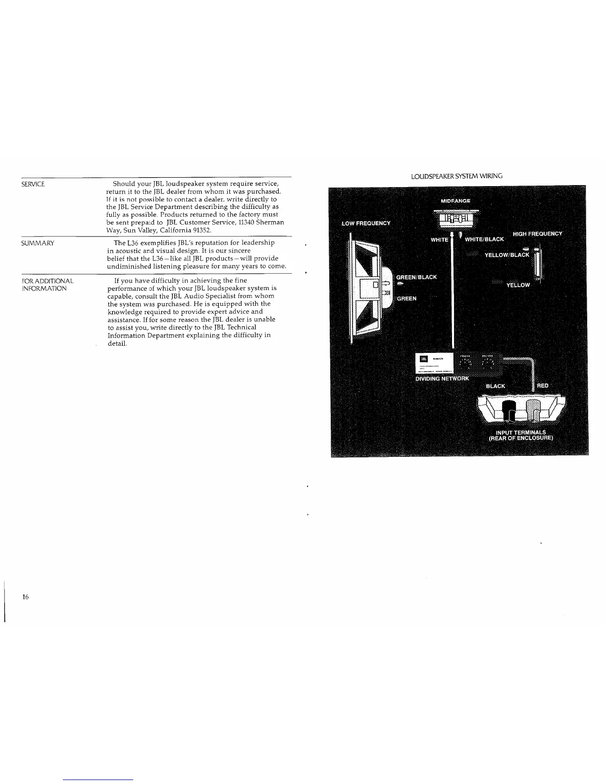 JBL L36 - SERVICE; SUMMARY; FOR ADDITIONAL INFORMATION; LOUDSPEAKER SYSTEM WIRING