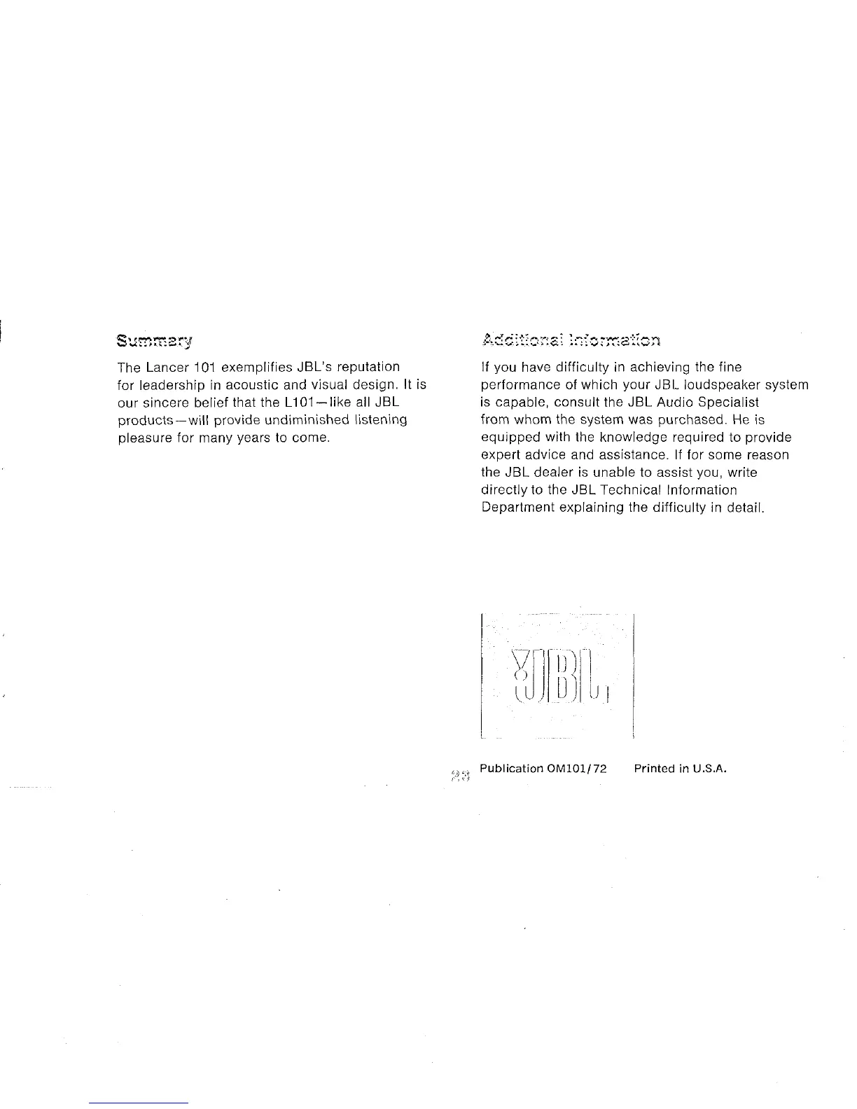 JBL Lancer L101 - Service and Warranty Information; Additional Information and Support