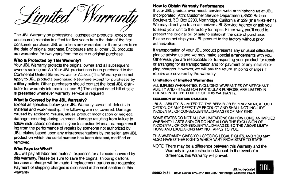 JBL; claims based upon any misrepresentations by the seller; any JBL