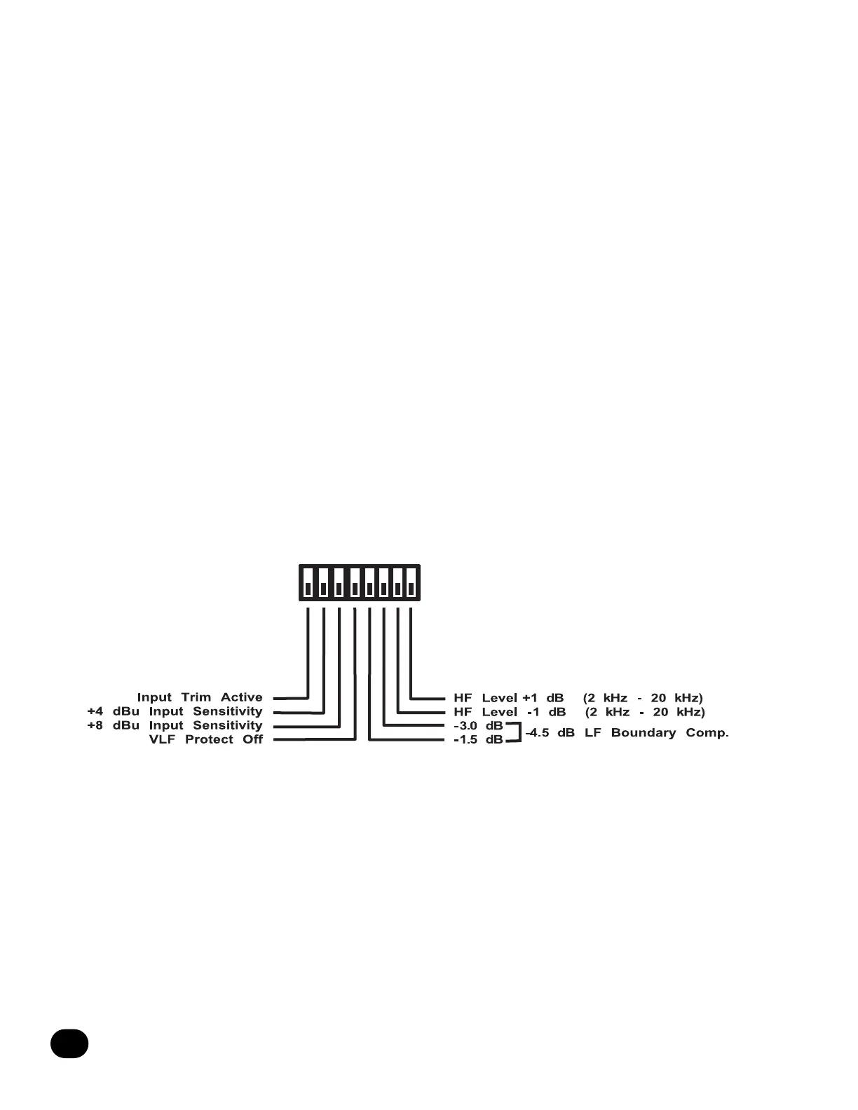 • Switch 3 lowers the input sensitivity to +8 dBu sensitivity when in the up position.