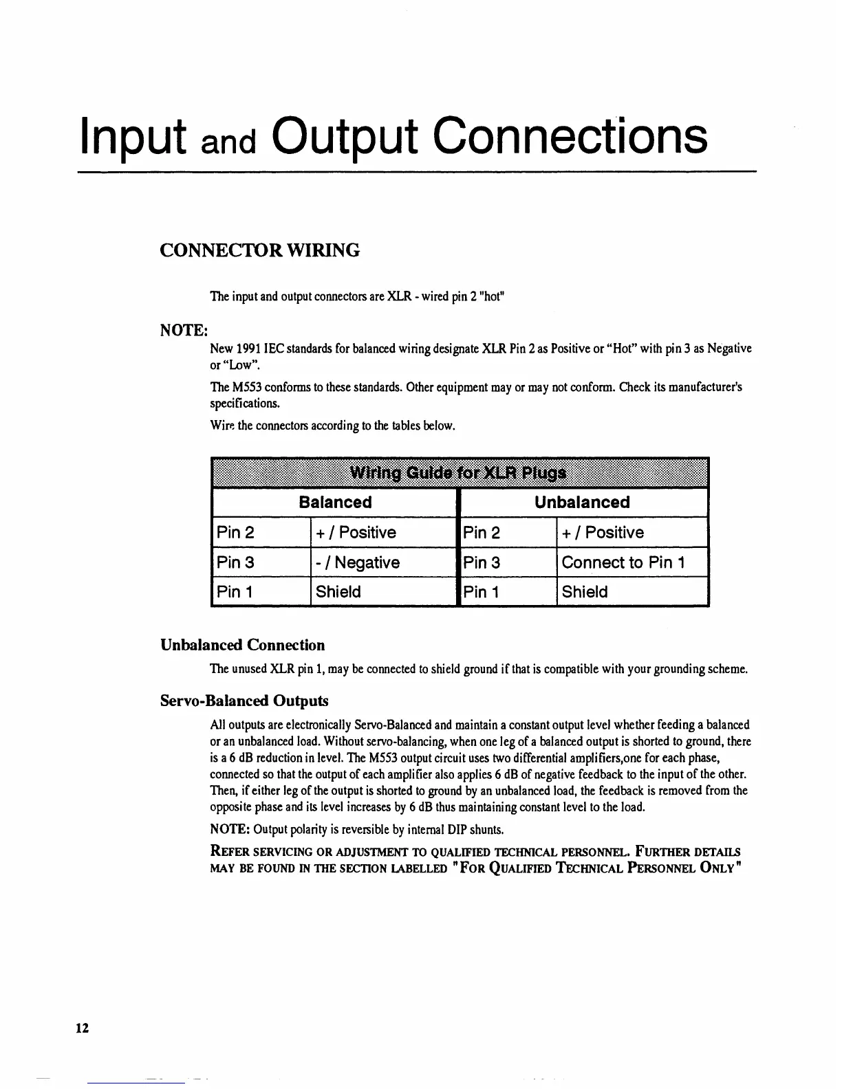 JBL M553 - Input and Output Connection Details; XLR Connector Wiring Guide; Servo-Balanced Output Functionality