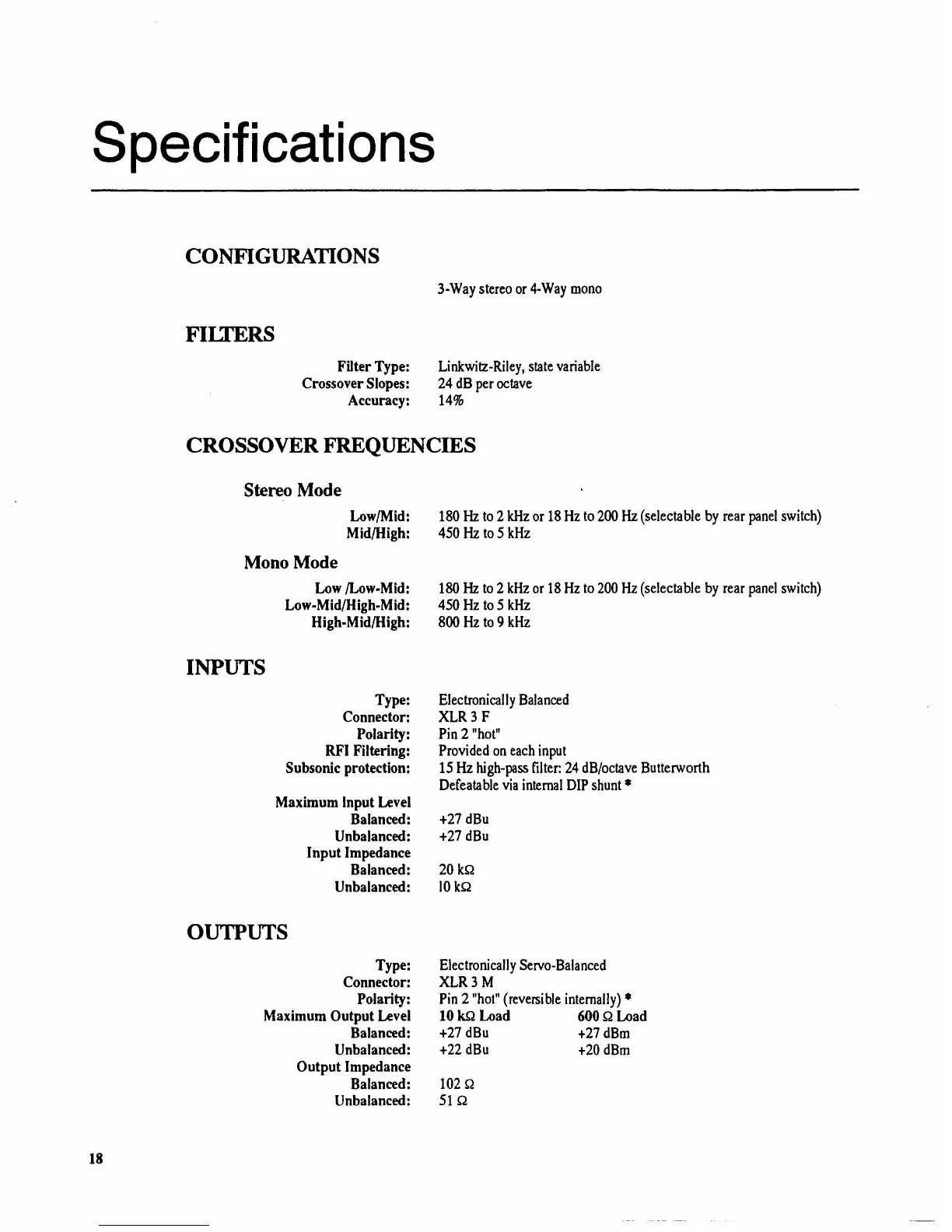 JBL M553 - Detailed Technical Specifications; Configurations, Filters, and Frequencies; Input and Output Specifications