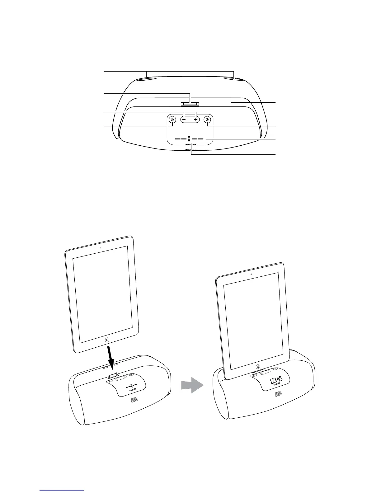 Telakointiura ja telakointiliitin: Aseta laite OnBeat aWaken telakointiuraan niin, että se