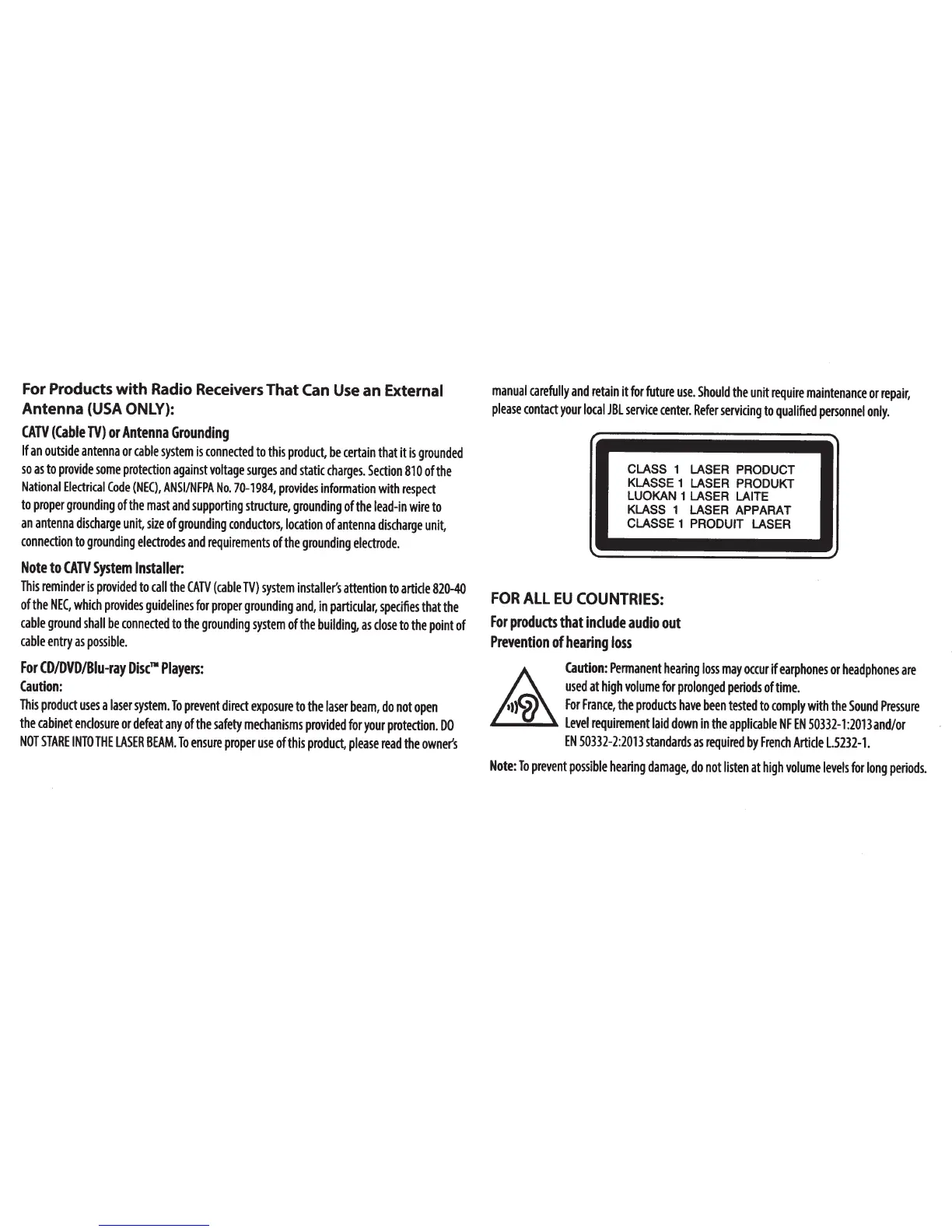 JBL Playlist - Product Specific Safety Notices; Antenna, Laser, and Hearing Safety