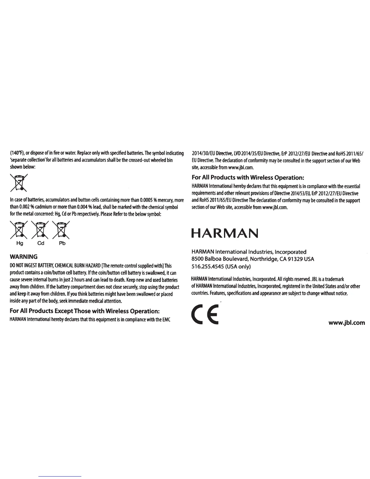 JBL Playlist - Product Compliance and Battery Safety; Battery Warnings and EMC Compliance