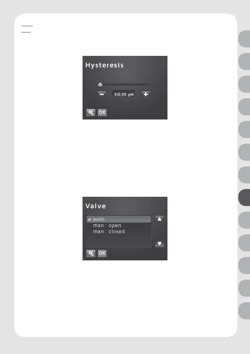 tröghetsvärden från 0,1 till 0,5 pH-enheter. Fabriksinställning: 0,1 pH.