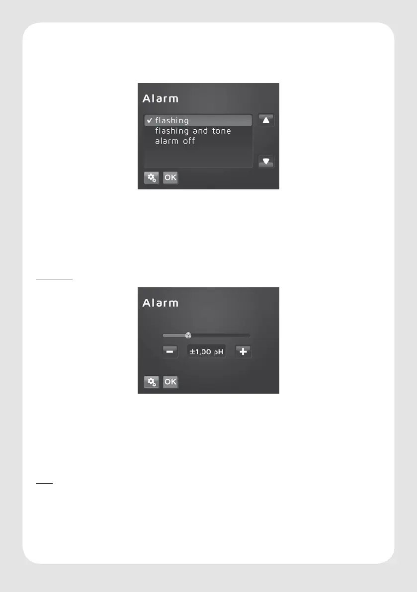 Som gränsvärden för larm kan du välja: +/-0,10 till +/- 2,00pH i steg om 0,05pH.