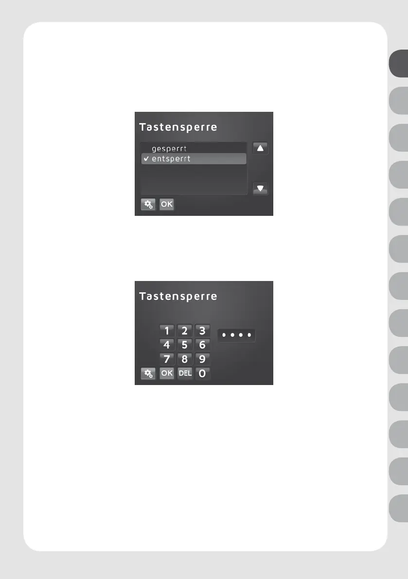 Einstellungen > Tastensperre wählen > Mit OK bestätigen > „Gesperrt“ / „entsperrt“ wählen >