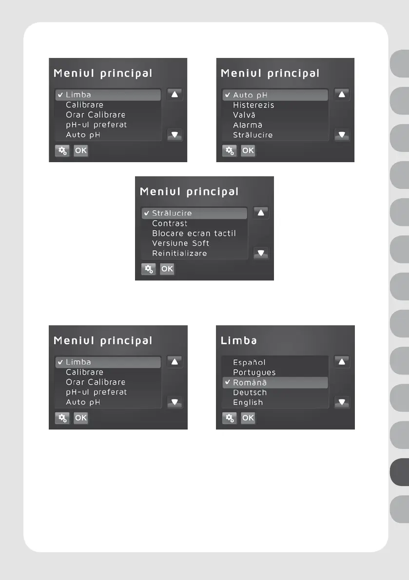 Setări > selecie limbă > conrmai cu OK > selectai limba dorită > conrmai cu OK. Părăsii