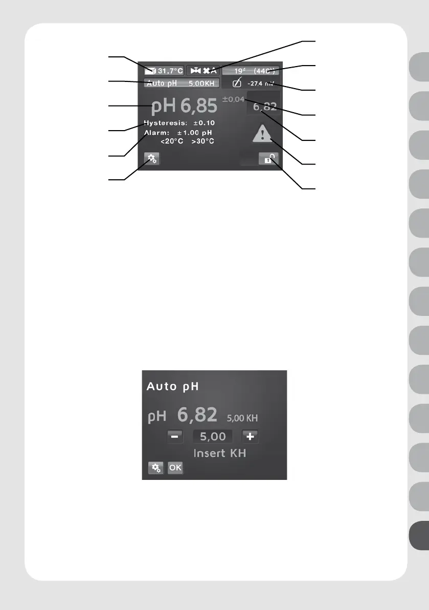 5 Ayarlanmış karbonat sertlğ değeryle brlkte otomatk pH’yı gösteren durum satırı