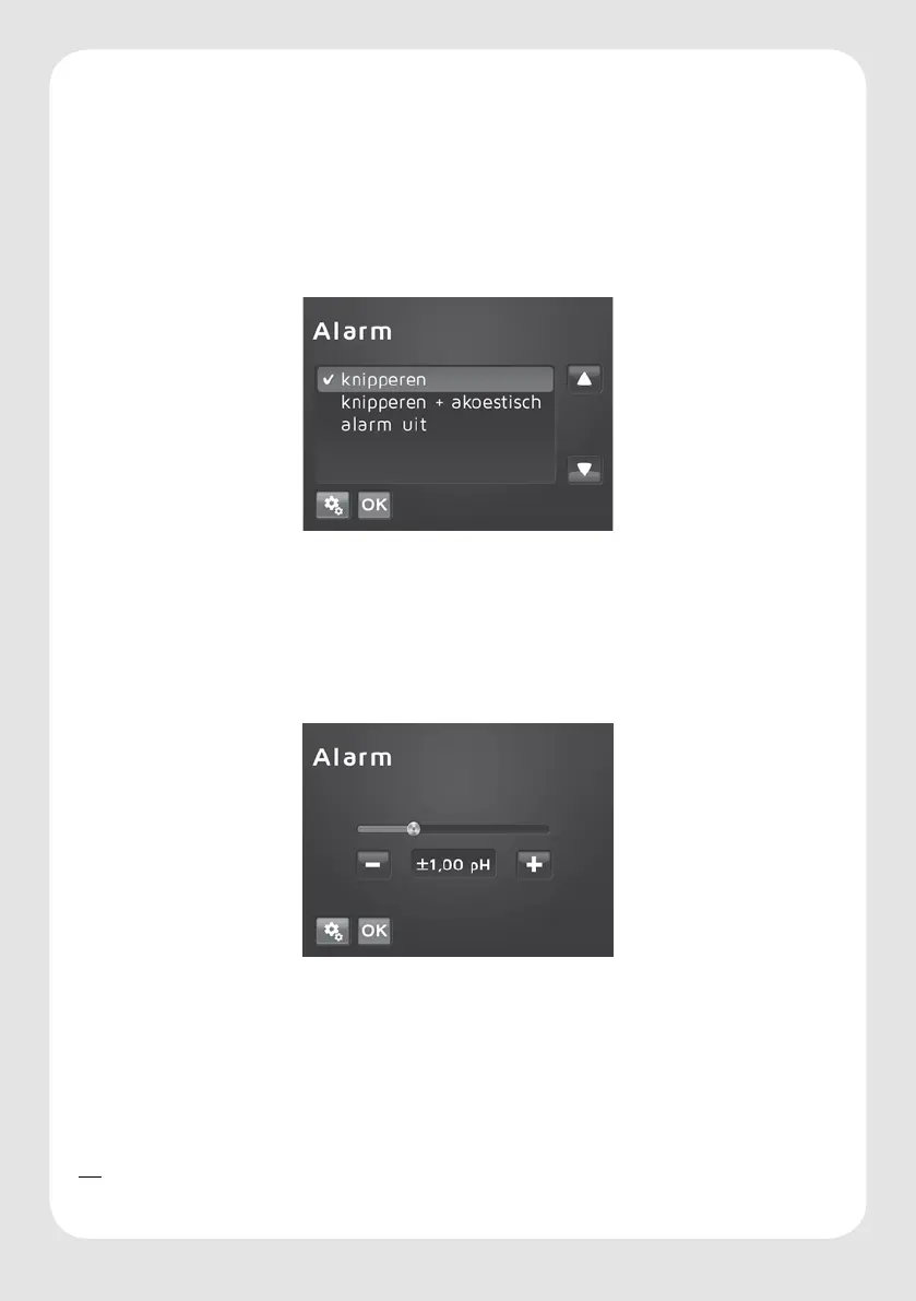 Als alarmgrenswaarde kunt u kiezen uit: +/- 0,10 - +/- 2,00 pH in stappen van 0,05 pH. De