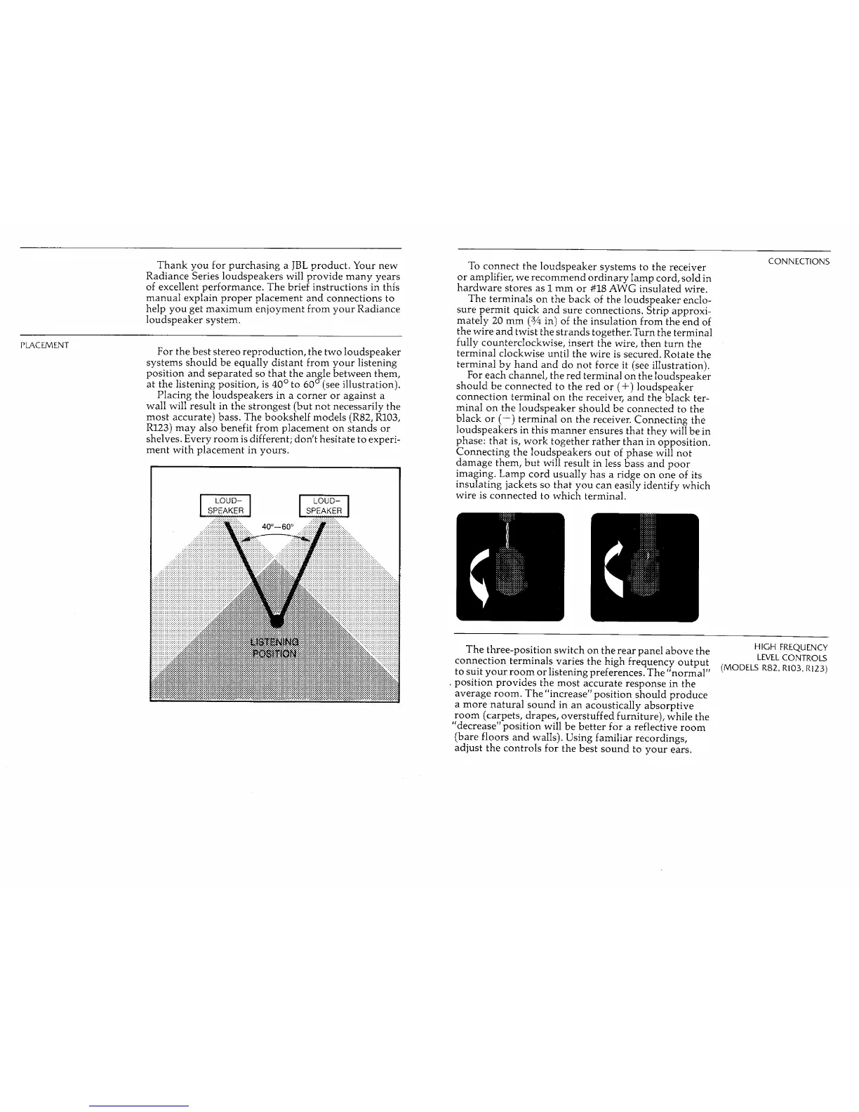 JBL R123 - Speaker Placement Guide; Optimal Listening Position; Loudspeaker Connections; Wire Connection Procedure