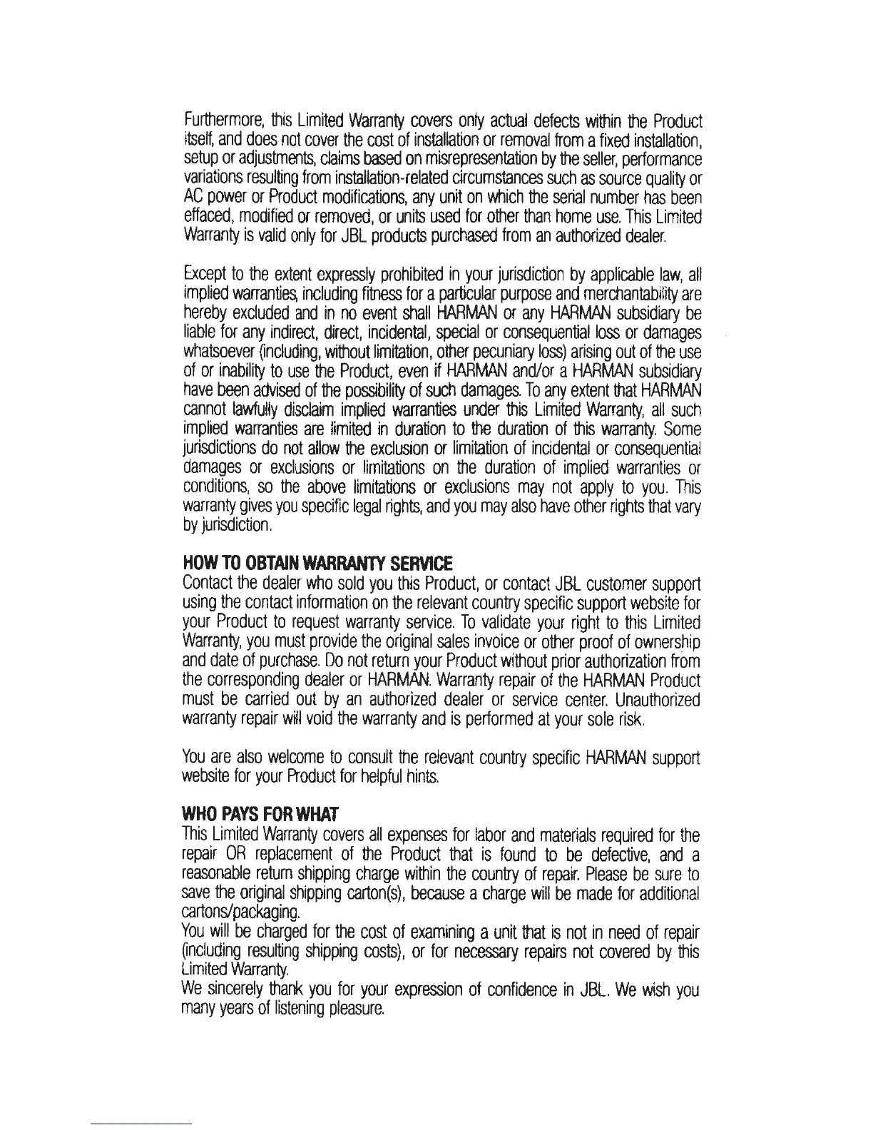 JBL Reflect Contour 2 - How to Obtain Warranty Service; Warranty Service Cost Allocation
