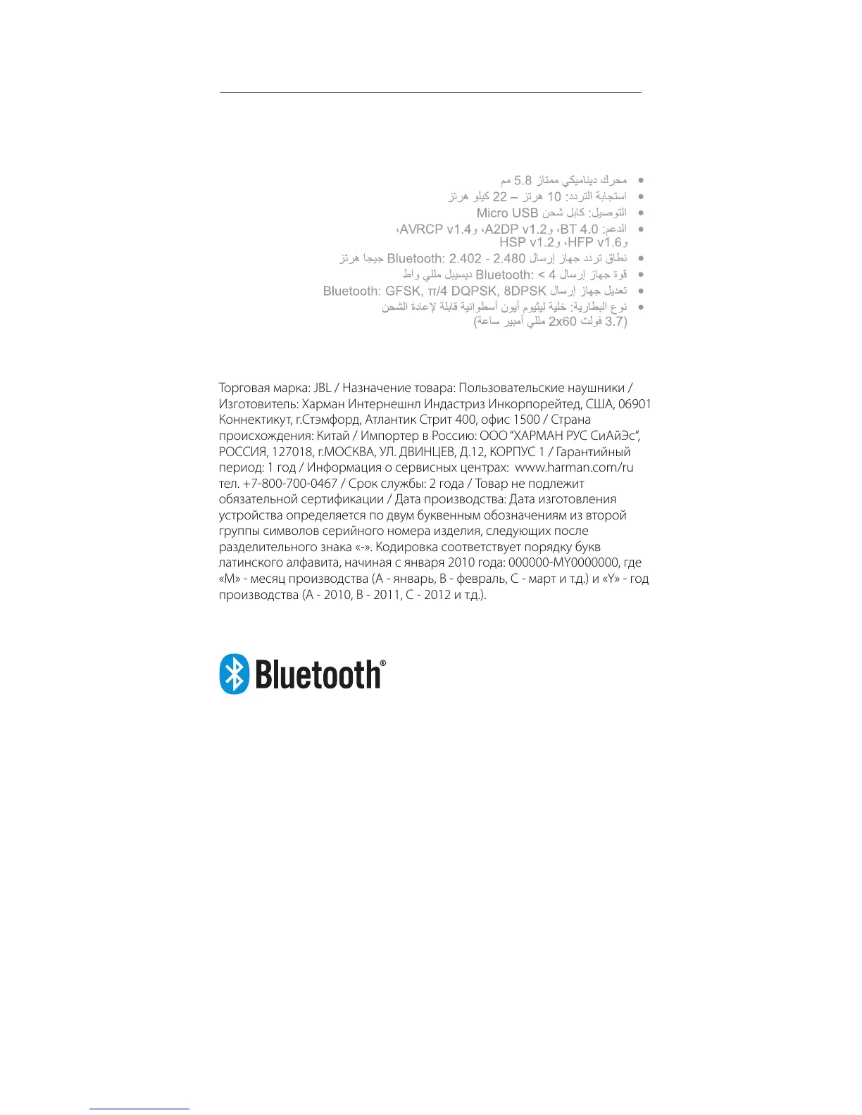период: 1 год / Информация о сервисных центрах: www.harman.com/ru