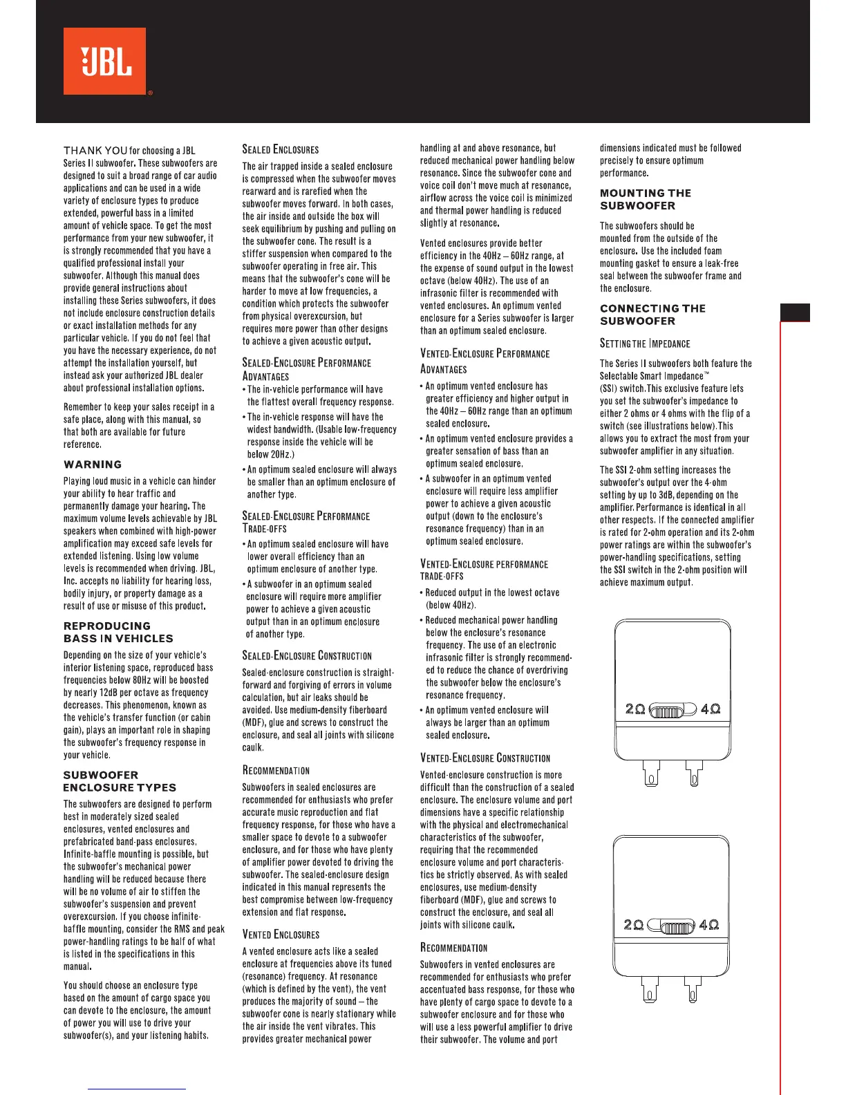 JBL S2-1024 - Series II Subwoofers Introduction; Reproducing Bass in Vehicles; Subwoofer Enclosure Types; Sealed Enclosure Details