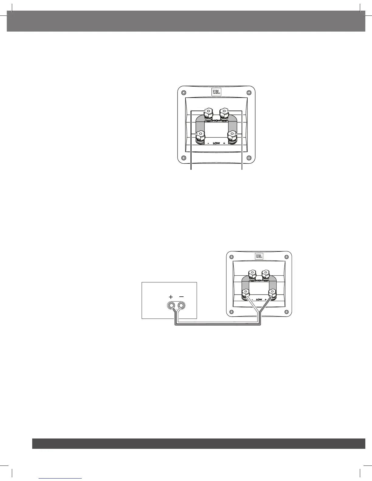 按照下图指示将放大器连接到每个扬声器上。您可以使用扬声器上的任何一组接头。注意:在连接扬声器导线时,请勿