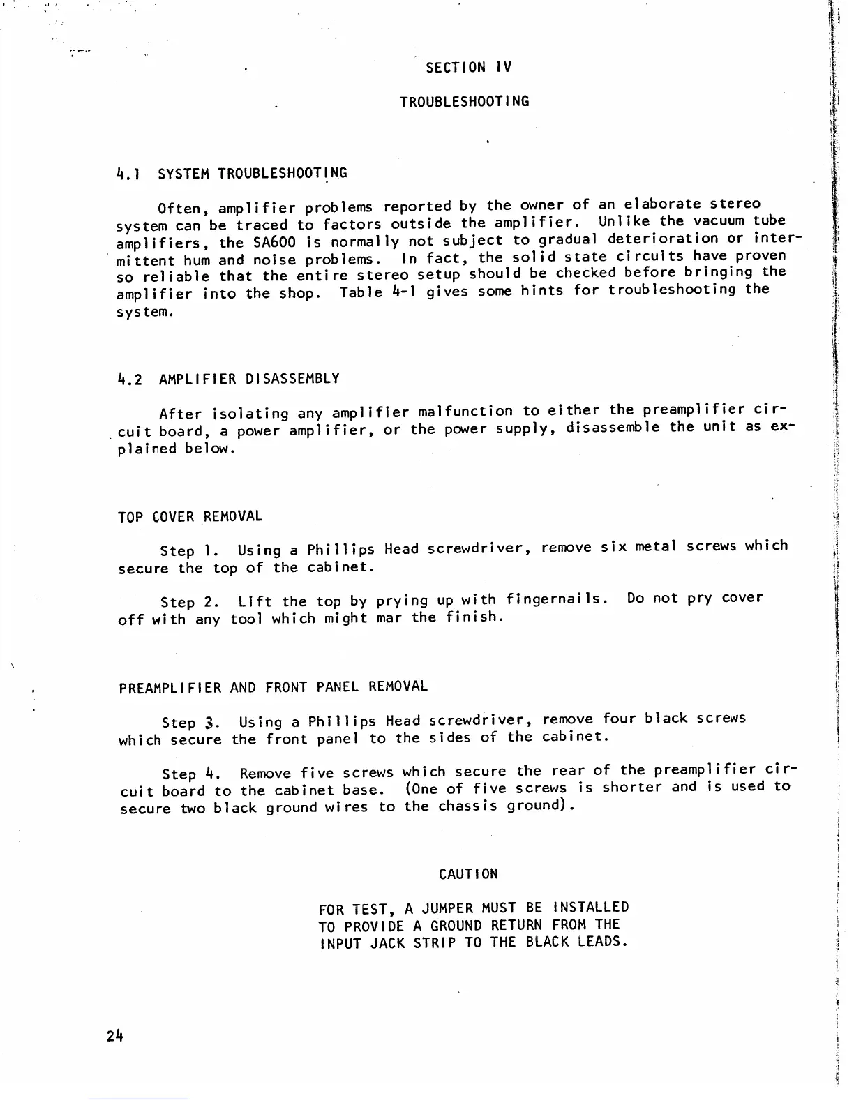 JBL SA600 - TROUBLESHOOTING; 4.1 SYSTEM TROUBLESHOOTING; 4.2 AMPLIFIER DISASSEMBLY PROCEDURES